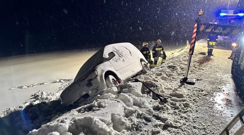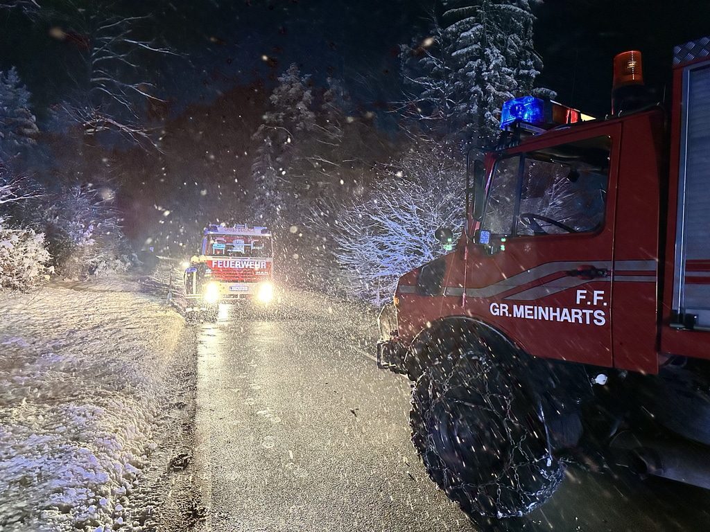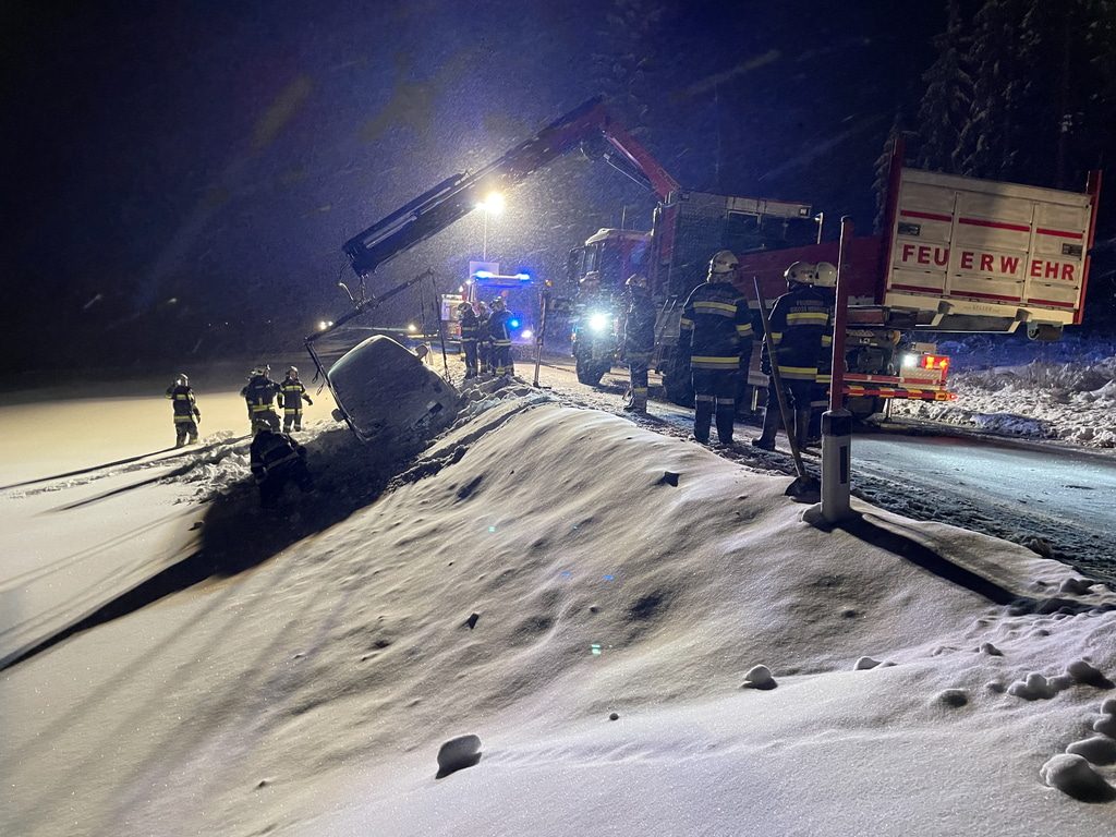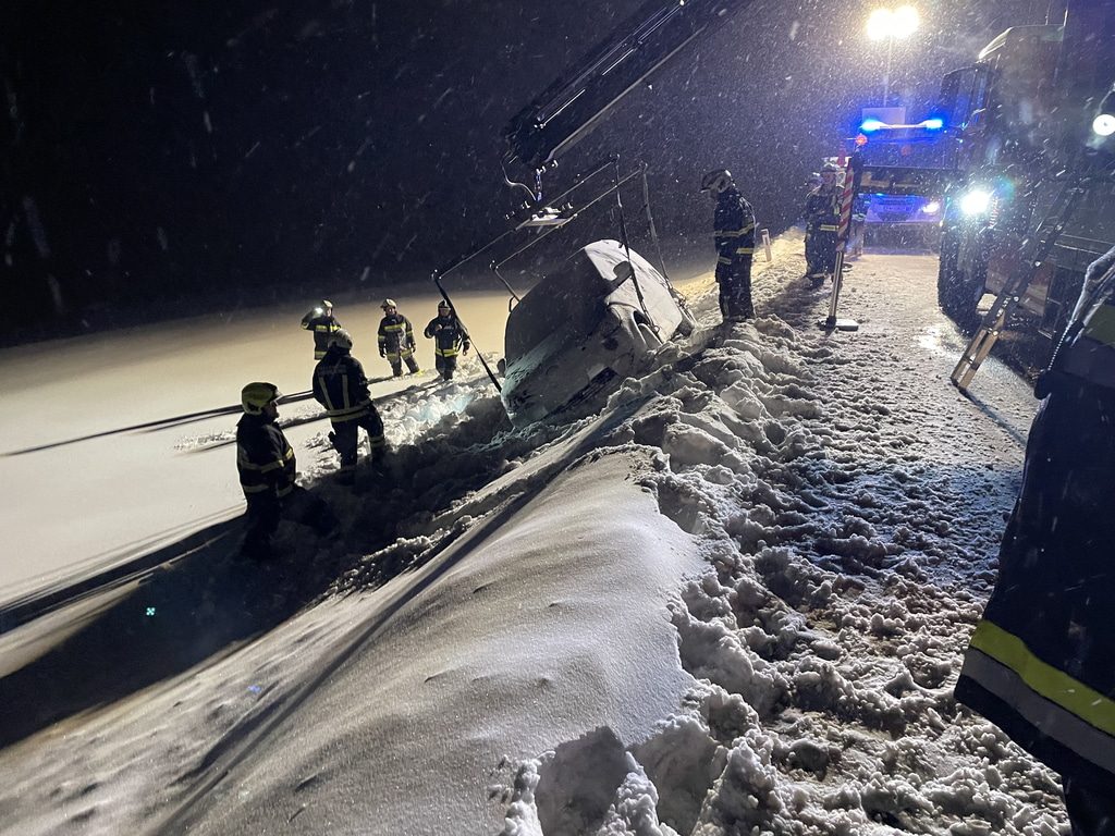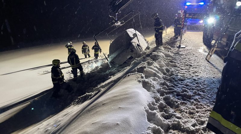 Am Samstag, den 03.12.2023, alarmierte uns Florian NÖ zu einer Fahrzeugbergung auf der B38 zwischen Groß Meinharts und Dietmanns. Auf der Schneefahrbahn war ein PKW vermutlich aufgrund schlechter Bereifung von der Fahrbahn abgekommen und auf der Böschung zu stehen gekommen. Da sich das Fahrzeug am Kipppunkt befand alarmierte die FF Groß Meinharts unser WLFA mit Kran.