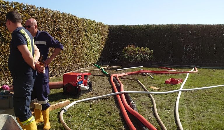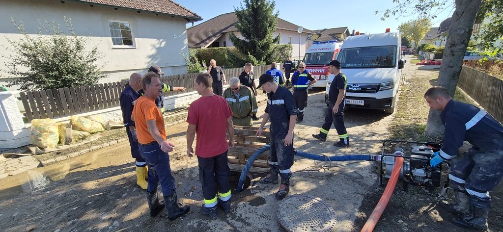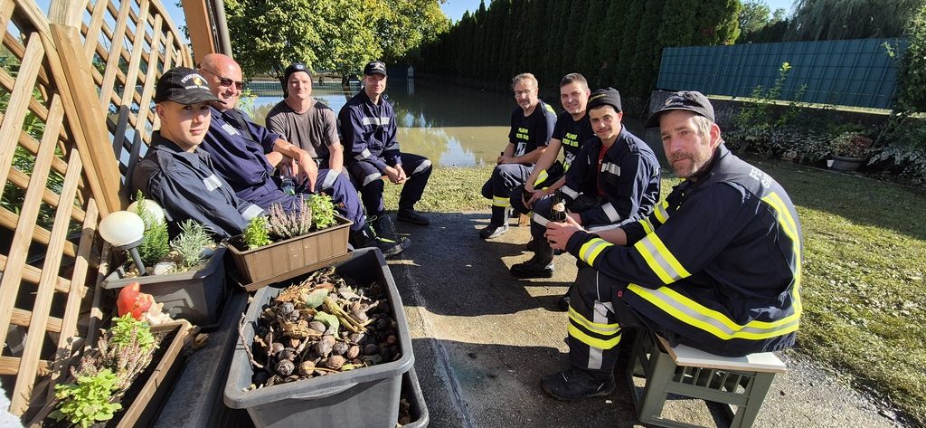 Bei unserer ersten Einsatzstelle in der Sackgasse halfen wir einer Familie bei Umschlichten von ca. 10 Festmeter teilweise durchnässtem Brennholz vom Keller auf die Terrasse. Nach einer kurzen Pause ging es dann ans Ende der Gasse “Am Moosfeld”, die nach einem Dammbruch der Perschling noch unter Wasser stand.  Dieses pumpten wir in das naheliegende Feld Richtung Donau. Anschließend halfen wir beim Auspumpen von Kellern und dem Ausräumen von zerstörtem Inventar. Neben umgekippten Öltanks, die entweder aufgerichtet oder entsorgt wurden, galt es auch Holzpellets zu beseitigen.