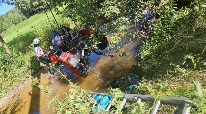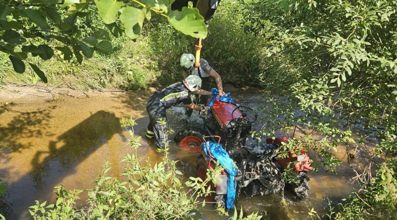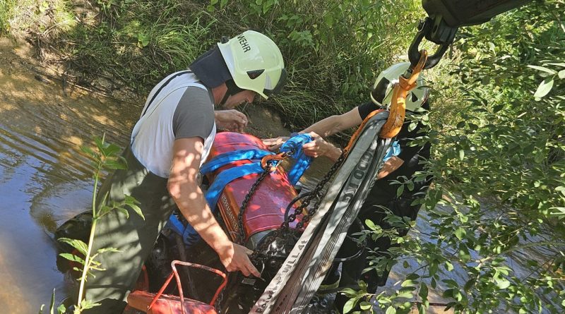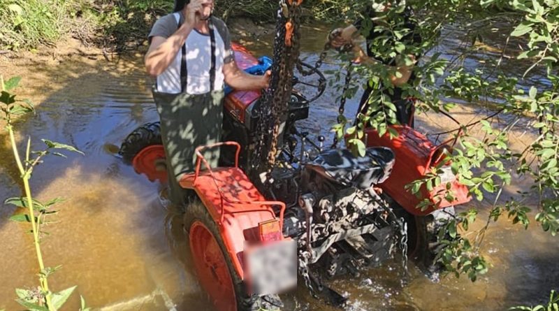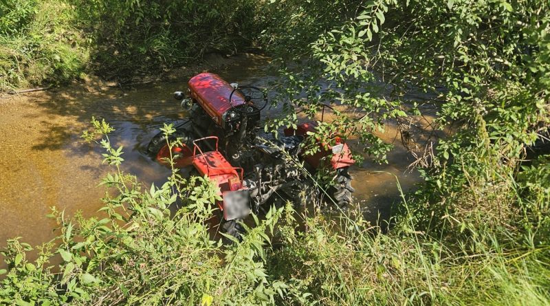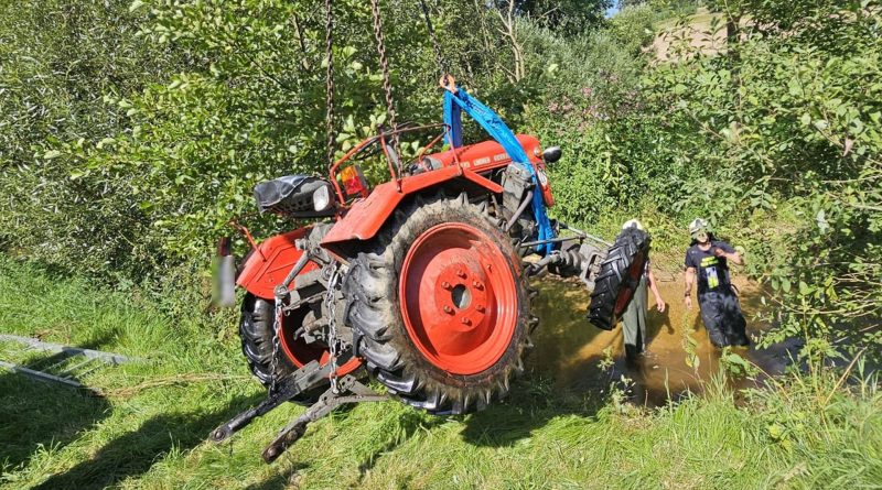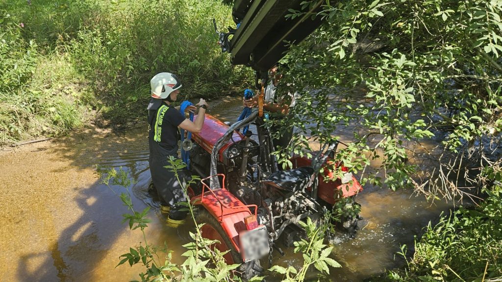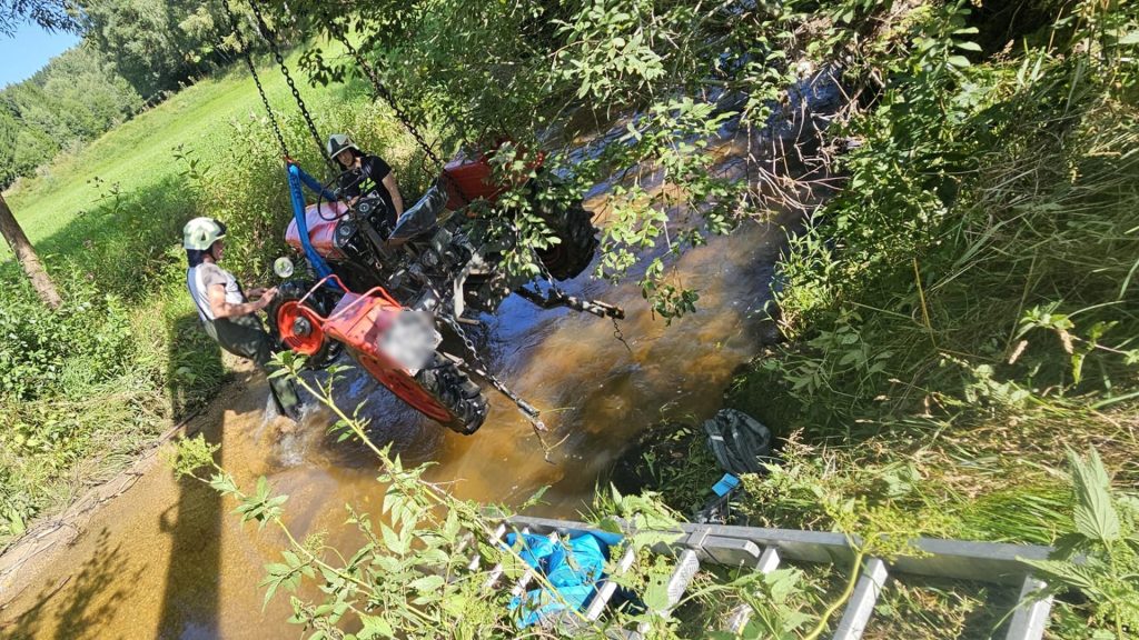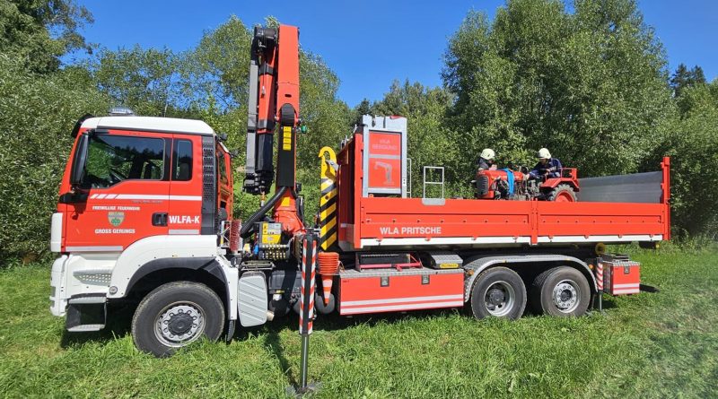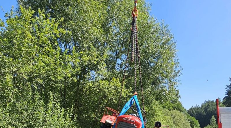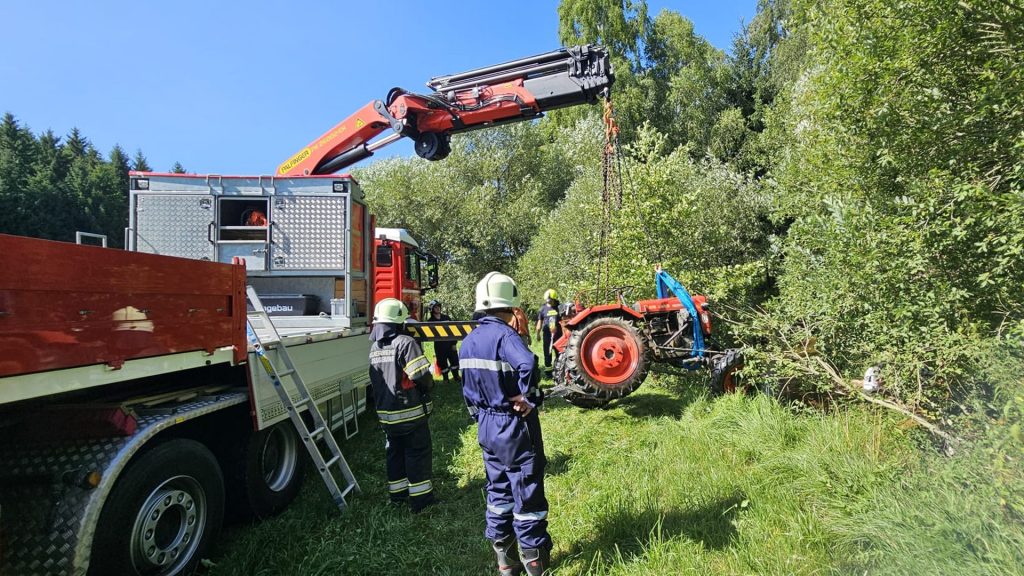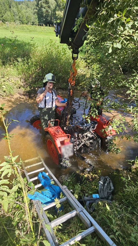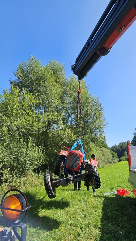 Dort angekommen fanden wir einen Traktor mitten in der Zwettl vor. Dieser war auf einer überschüssigen Wiese in den Bach gerollt. Der Fahrer war schon abgestiegen gewesen. Zwei Florianis stiegen in Wathosen in den Bach und befestigten mehrere Rundschlingen am Traktor. Anschließend hoben wir die Arbeitsmaschine mittels Kran aus dem Bachbeet, verluden sie und brachten sie zur nahegelegenen Garage des Besitzers. Es gab weder einen Öl noch Dieselaustritt. Nach ca. 1.5 Stunden konnten wir den Einsatz erfolgreich beenden.